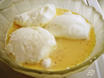 - A tejet a félbevágott vaníliarúddal feltesszük forrni, közben a tojások sárgáját és fehérjét különválasztjuk. - A fehérjét egy csipetnyi sóval kemény habbá verjük, kanállal felhőcskéket szaggatunk belőle, a forró tejben mindkét oldalukon 1-1 percig főzzük, majd szűrőkanállal tálra szedjük. - A tojások sárgáját a kristálycukorral habosra keverjük, szinte fehéredésig, ezután hozzákeverjük a barna rizslisztet. - Kanalanként keverjük bele a tűzről levett forró tejet, azután az egészet visszaöntjük a tejes edénybe, beledobjuk a fahéjat, és forralunk egyet rajta. Tálba öntjük, a habot rátesszük, lehűtve tálaljuk.
